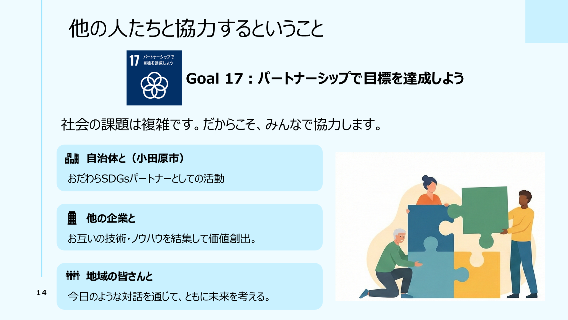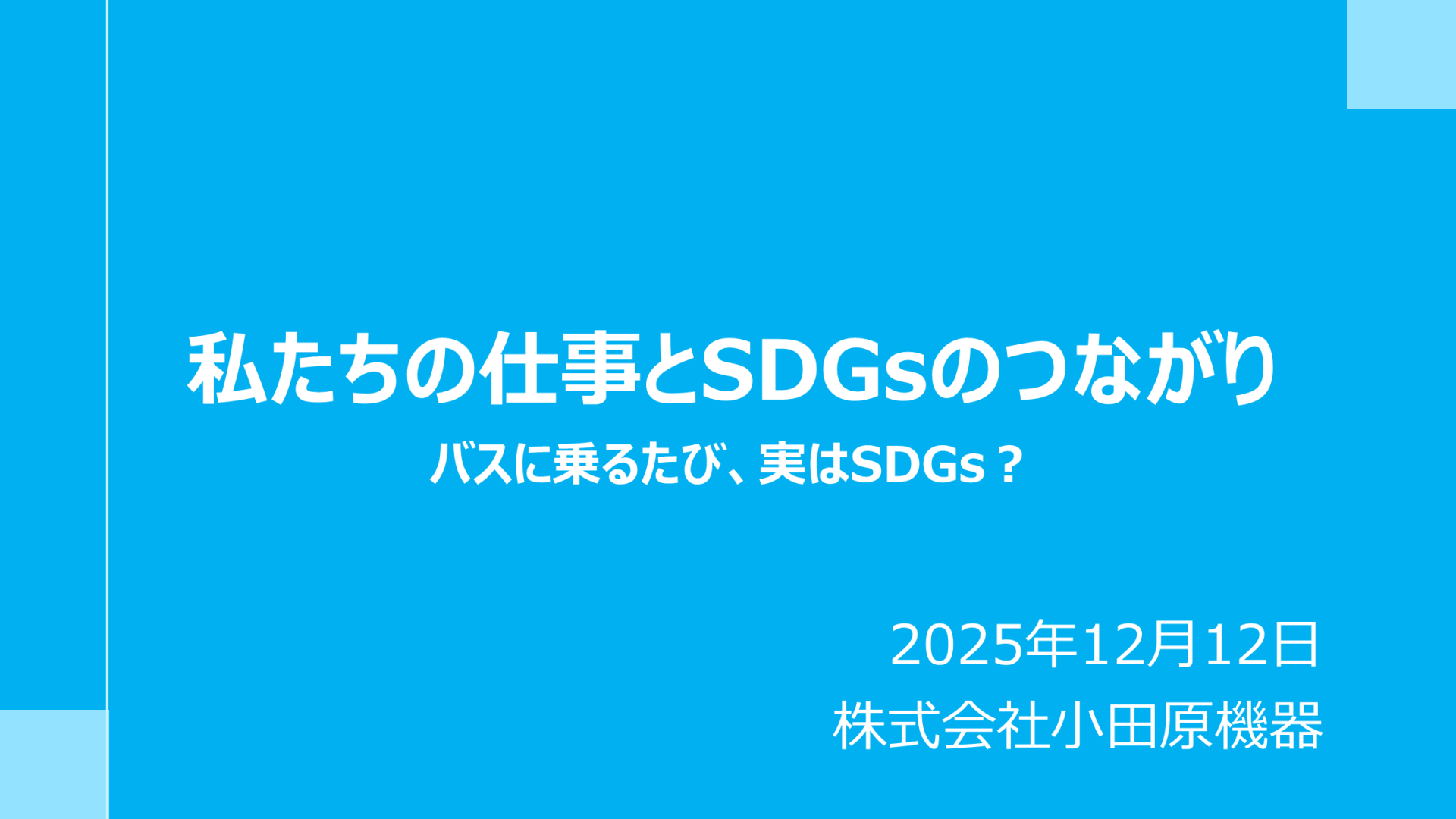 2025年12月に相洋高等学校にて、おだわらSDGsパートナーによる出前講座が実施されました。 当社も講師として、SDGsの取り組みをはじめ、業務内容や仕事のやりがいなどについて、講義を行いました。 地域の仕事や働くことに対する意識を高める一助となればと思っております。 プレゼンテーション資料は、以下に掲載しております。